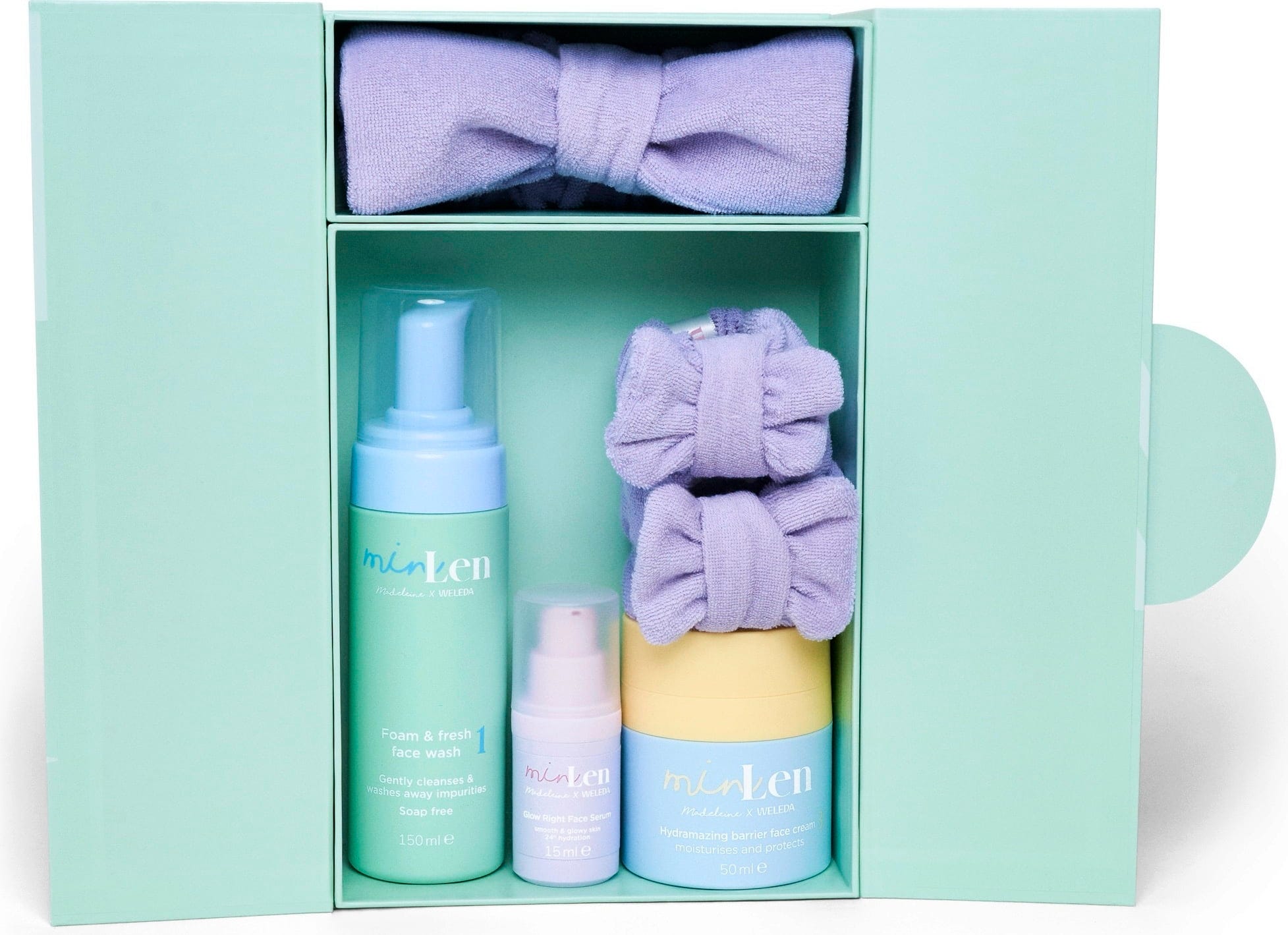 Rutina zilnică de îngrijire începe cu o bentiță pentru păr – la finalul acesteia, obții un chip luminos! În cutia drăguță și reutilizabilă se află un trio delicat pentru curățare și îngrijirea feței. Setul include o bentiță pentru păr și două brățări pentru încheieturi, asigurând o rutină fără stres - astfel apa și produsele de îngrijire nu ajung în păr iar părul rămâne departe de față. În acest mod, îngrijirea zilnică devine o joacă de copii!