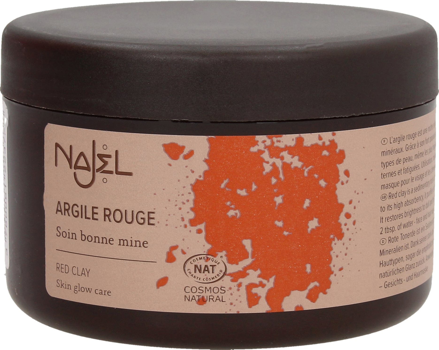 Cu această argilă roșie extra fină, Najel oferă o bază optimă pentru măștile de îngrijire proprii. Acest pământ argilos este bogat în oligoelemente, care hrănesc pielea în timp ce o curăță profund. În plus, argila roșie are proprietăți echilibrante și de îngrijire.