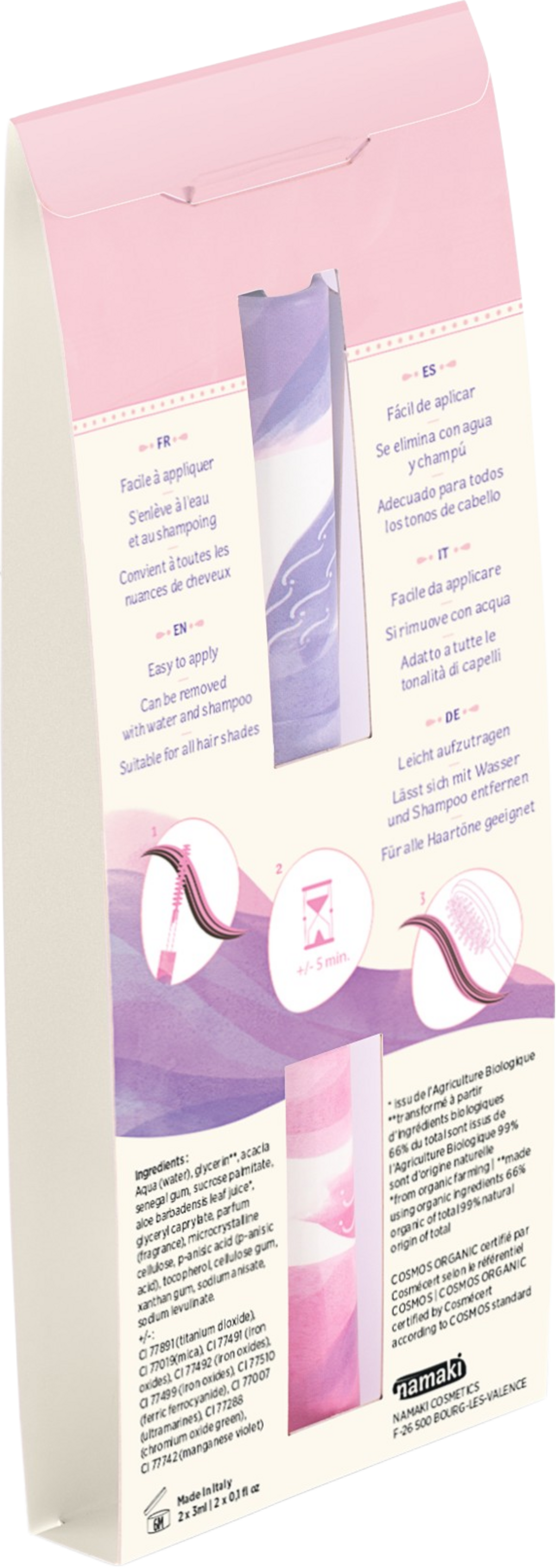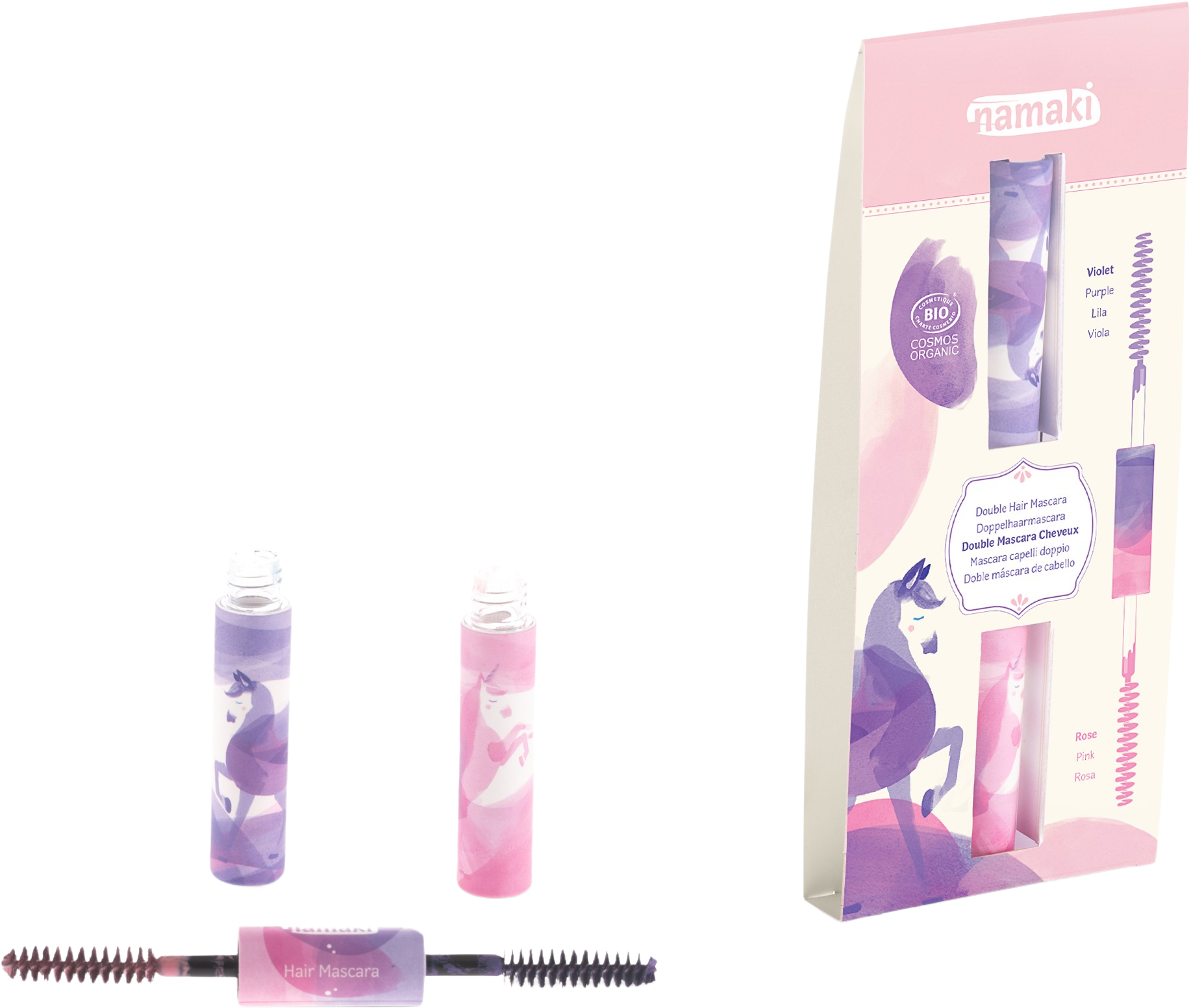 Această mascara pentru păr destinată copiilor este ușor de aplicat și la fel de ușor de clătit. Poate fi utilizată pe toate nuanțele de păr și oferă, datorită periei duble practice, două culori într-un singur produs. Formula sa conține ingrediente naturale, precum Aloe Vera bio, glicerină sau gumă de acacia, care sunt complet sigure pentru copii și pentru mediul înconjurător și oferă un rezultat colorat extraordinar.