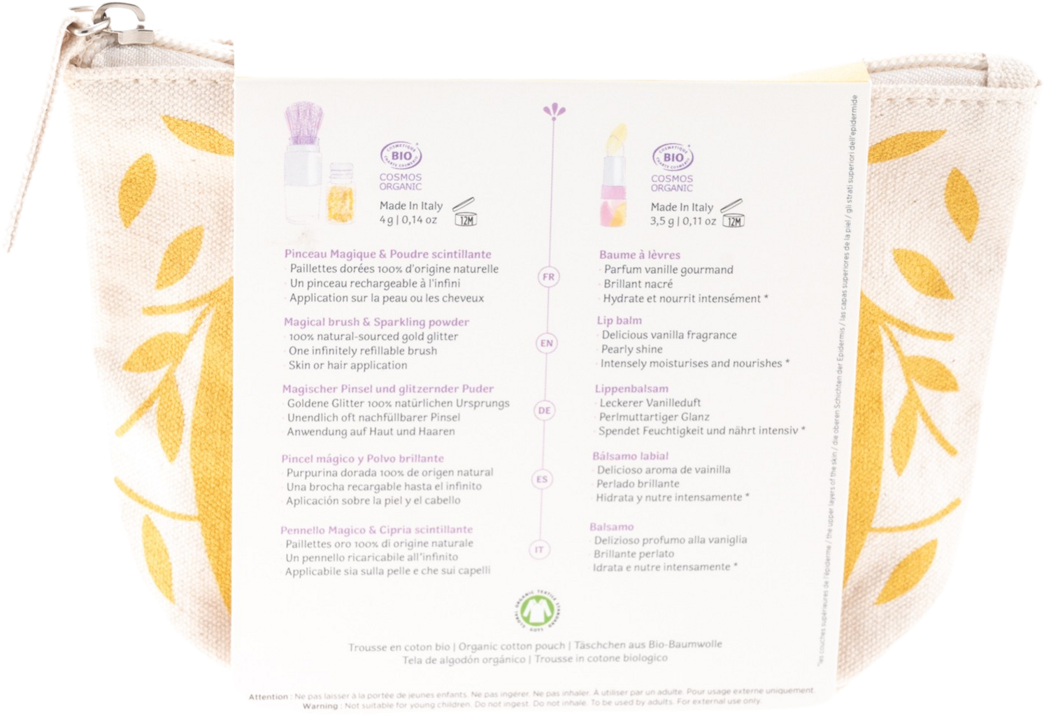 În această geantă drăguț imprimată vei găsi balsamul de buze strălucitor cu vanilie și pudra aurie strălucitoare într-o pensulă reumplibilă. Ambele produse sunt hipoalergenice și sigure pentru jocurile de machiaj ale celor mici.