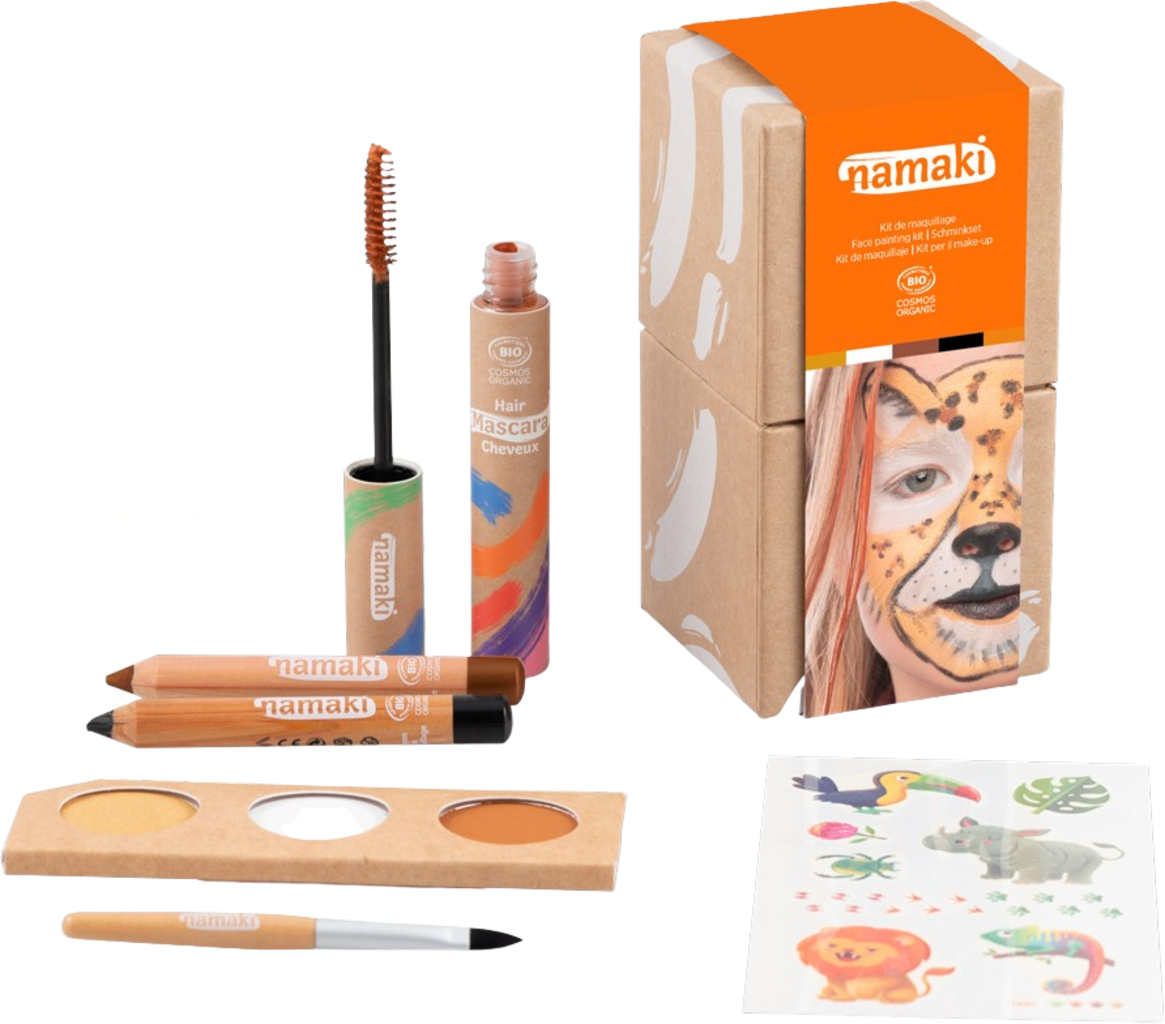 Această trusă de machiaj cuprinzătoare le permite celor mici să exploreze lumea animalelor sălbatice! Include trei culori, pensule, creioane pentru detalii și vopsea pentru păr. Toate sunt certificate și sigure de utilizat.