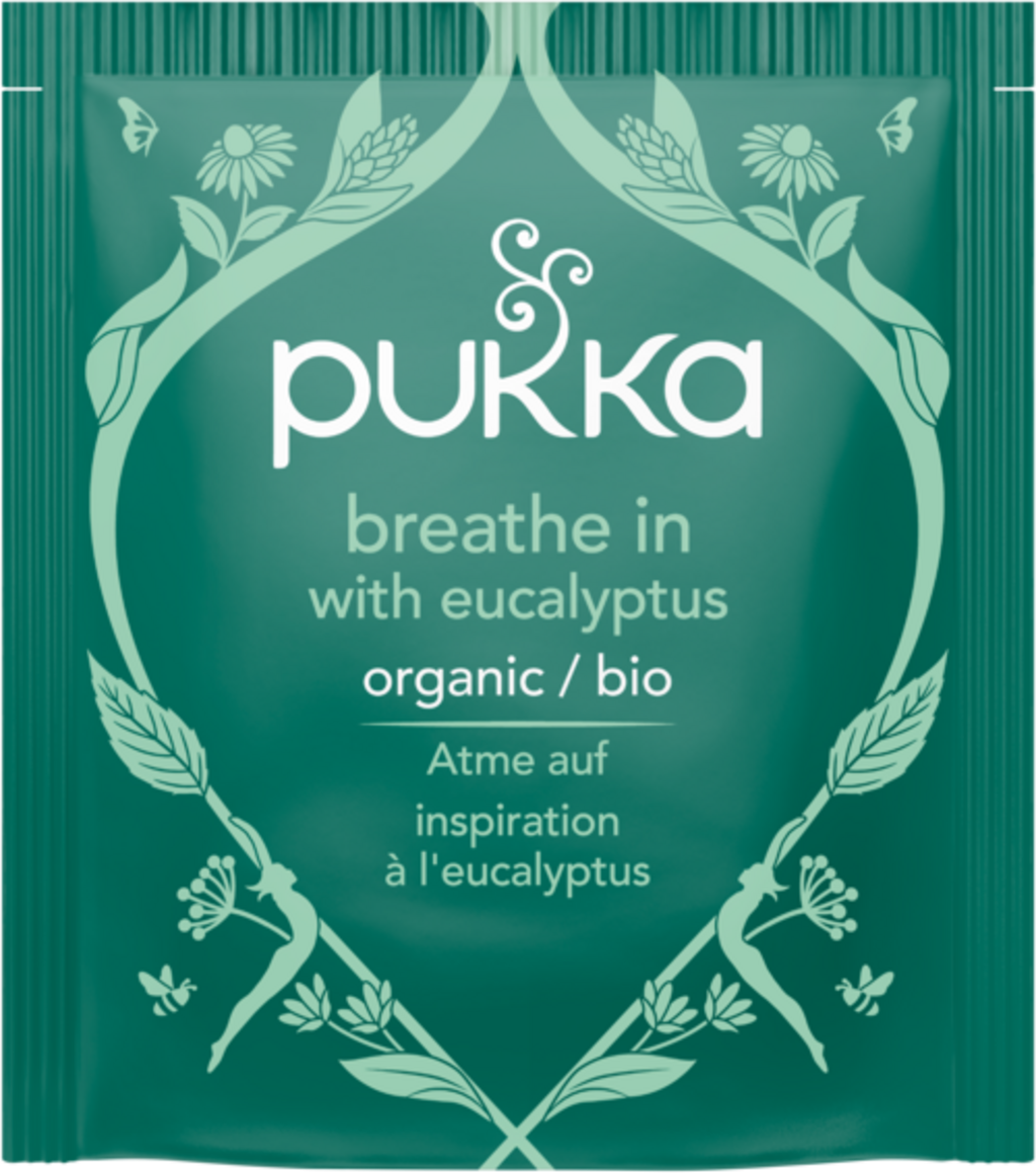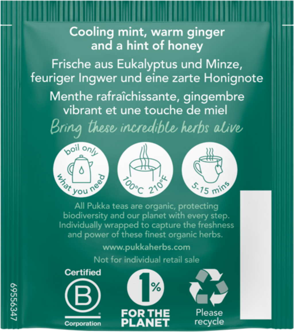 Acest ceai din plante, armonios compus, oferă plăcerea perfectă pentru a te relaxa și a respira ușor. Gustul său revigorant trezește simțurile și te inspiră chiar și în zilele mohorâte. Notele intense de eucalipt, mentă și ghimbir picant sunt completate de o notă fină de miere, oferind o experiență aromatică intensă.