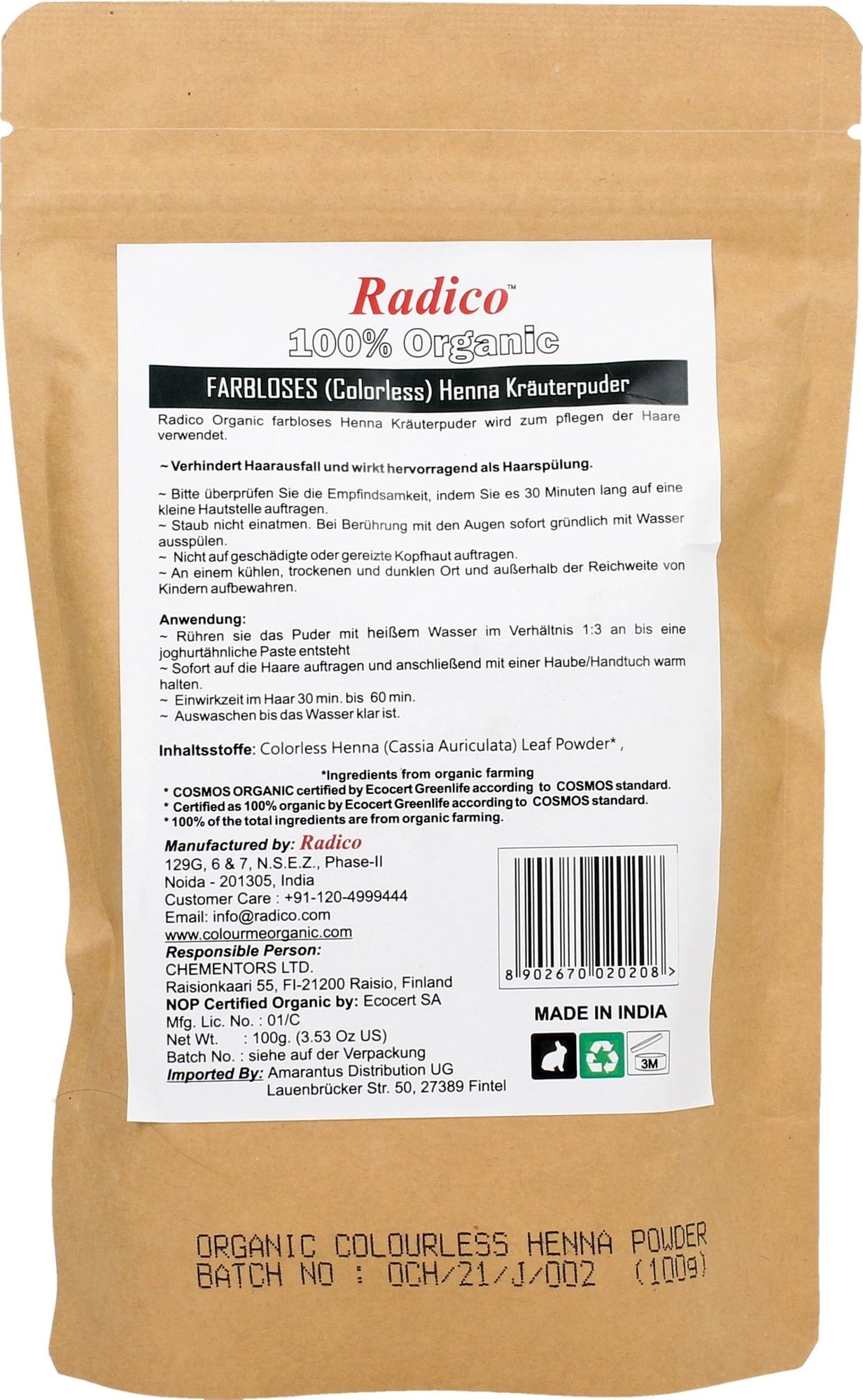 Radico Pudră de Cassia bio (henna neutră), 100 g 33,89 lei (338,90 lei / kg)