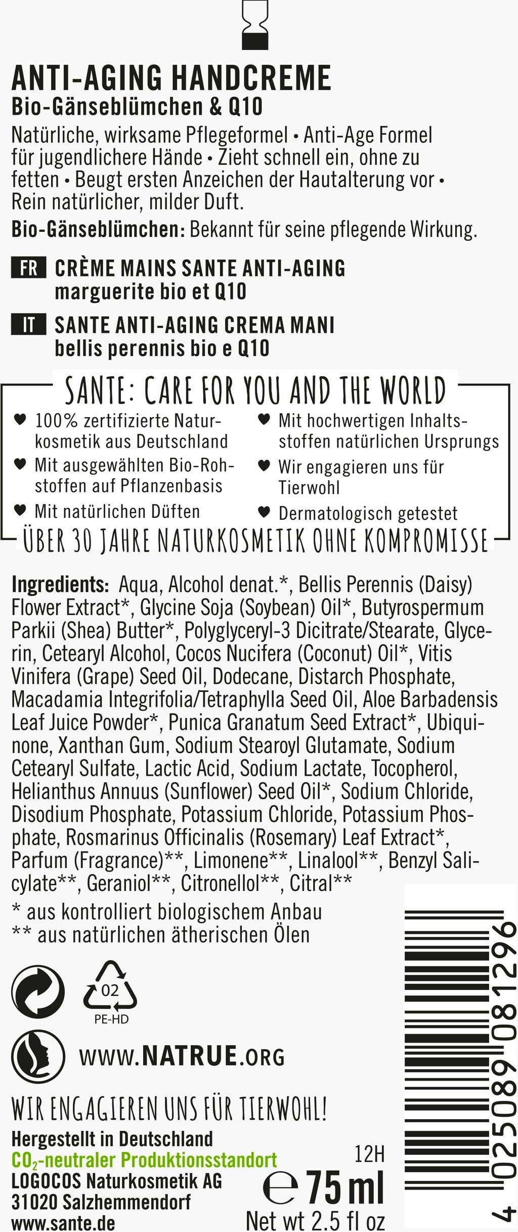 Aqua, Alcohol Denat[1], Bellis Perennis Flower Extract[1], Glycerin Soja Oil[1], Butyrospermum Parkii (Shea) Butter[1], Polyglyceryl-3 Dicitrate/Stearate, Glycerin, Cetearylalcohol, Cocos Nucifera (Coconut) Oil[1], Vitis Vinifera Seed Oil, Dodecane, Distarch Phosphate, Macadamia Ternifolia Seed Oil, Aloe Barbadensis (Aloe Vera) Leaf Juice Powder[1], Punica Granatum (Pomegranate) Seed Extrakt[1], Ubiquinone, Xanthan Gum, Sodium Stearoyl Glutamate, Sodium Cetearyl Sulfate, Lactic Acid, Tocopherol (Vitamin E), Helianthus Annus (Sunflower) Seed Oil[1], Sodium Chloride, Disodium Phosphate, Potassium Chloride, Potassium Phosphate, Rosmarinus Officinalis Leaf Extract[1], Parfum[2], Limonene[2], Linalool[2], Benzyl Salicylate[2], Geraniol[2], Citronellal[2], Citral[2]