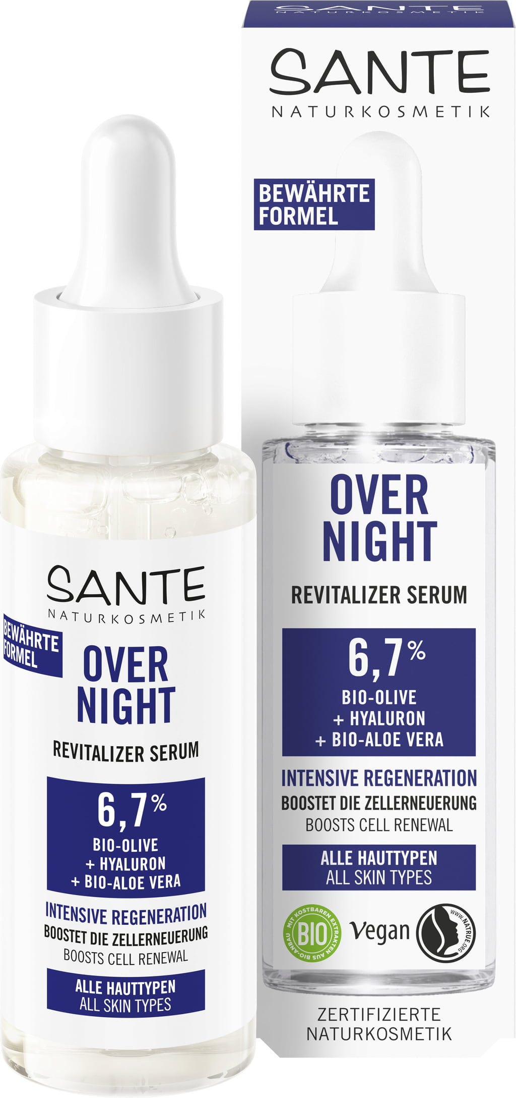 Serul revitalizant de la SANTE susține regenerarea pielii în timpul somnului și îi oferă o hidratare intensivă. Complexul de acid hialuronic, aloe vera bio și ulei de măsline bio optimizează suplețea și luptă împotriva primelor riduri. Textura ușoară se aplică ideal și se absoarbe rapid.