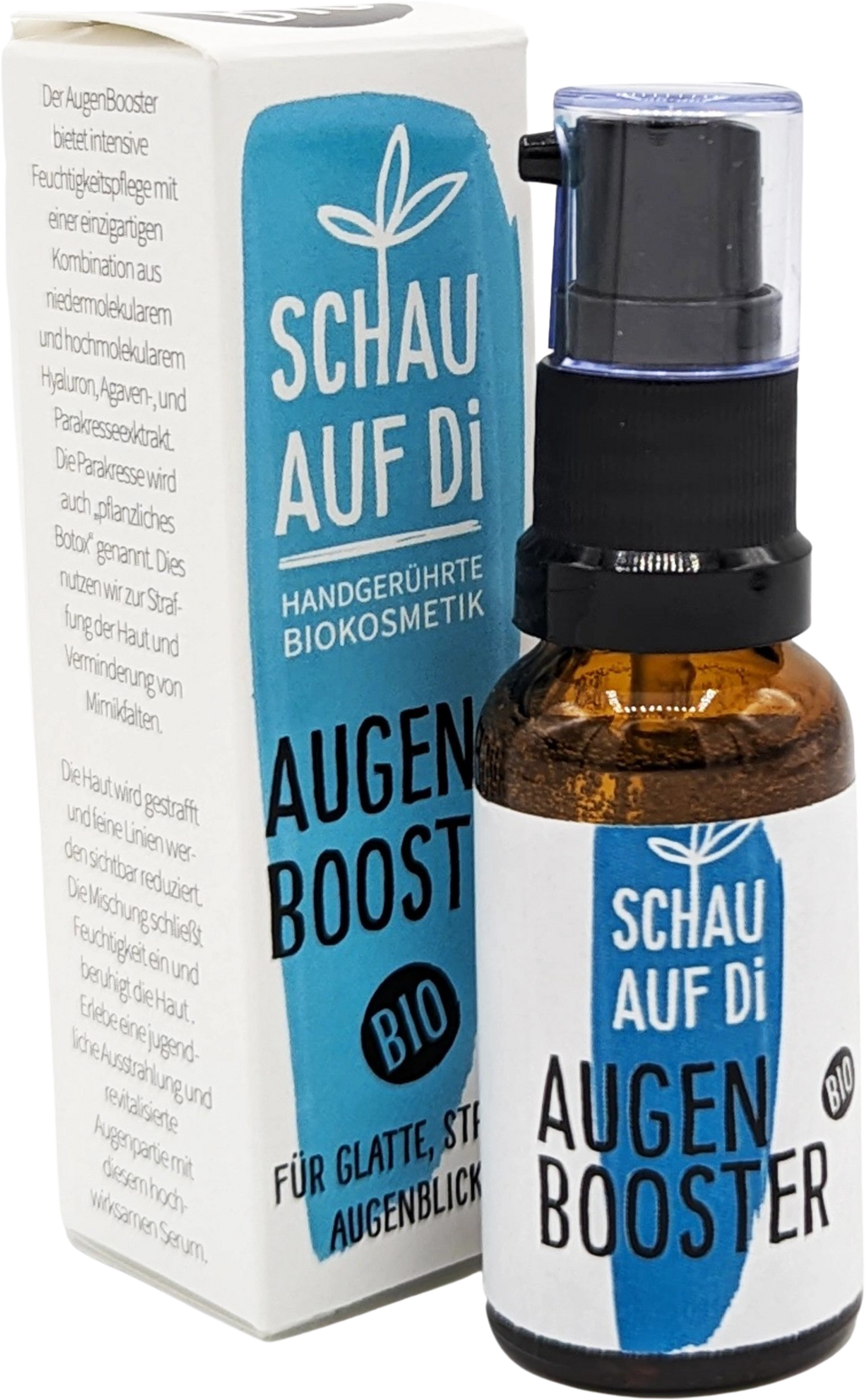 AugenBooster de la SCHAU AUF Di este alegerea perfectă pentru cei care doresc să își răsfețe zona ochilor cu un tratament de înaltă calitate. Formula specială combină ingrediente naturale selectate cu expertiză modernă pentru a îngriji în mod ideal pielea sensibilă din jurul ochilor. Combinarea eficientă a parakressei cu acid hialuronic cu masă moleculară mare și mică oferă hidratare și umple instantaneu liniile fine.