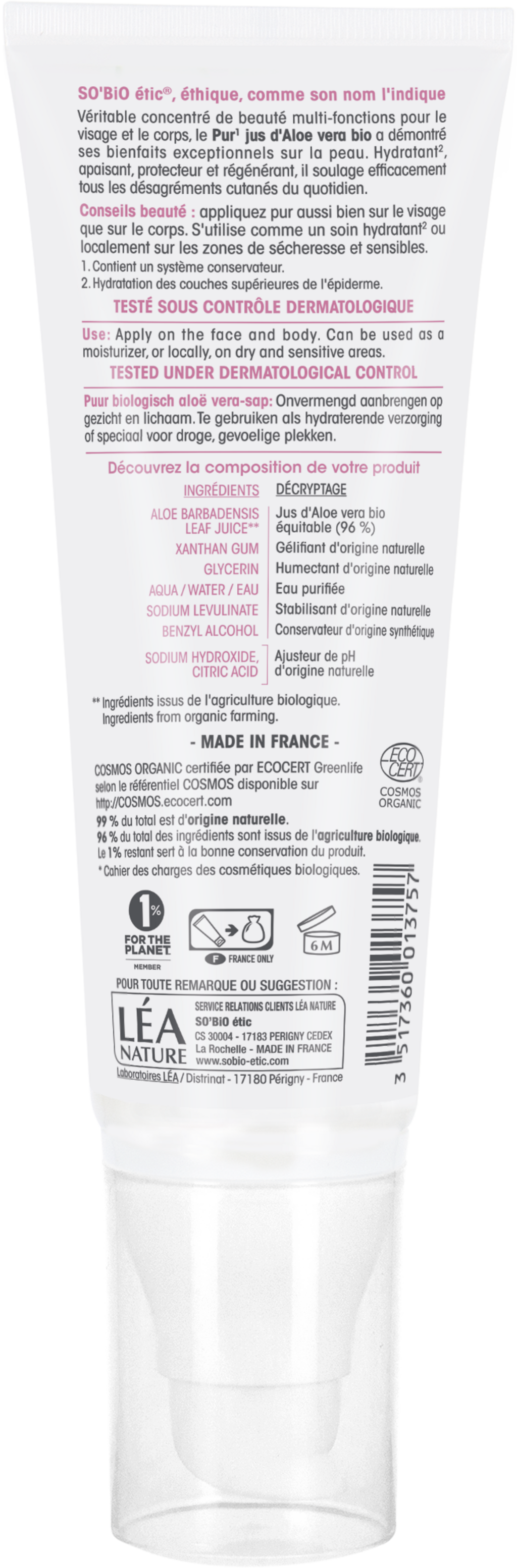 Aloe Barbadensis Leaf Juice[1], Pentylene Glycol, Xanthan Gum, Glycerin, Aqua, Sodium Levulinate, Sodium Benzoate, Lactic Acid, Sodium Hydroxyde, Citricacid