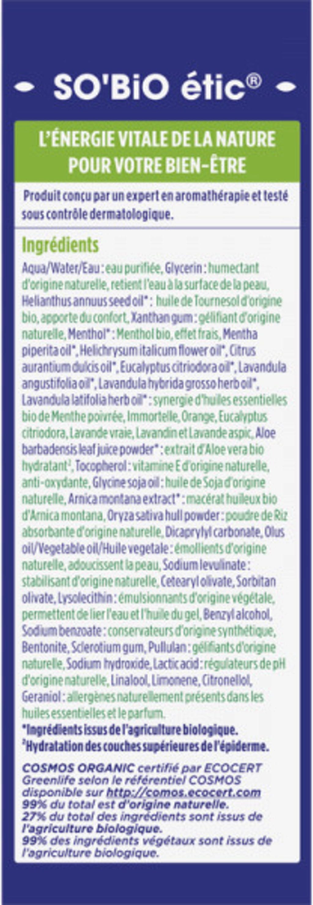 Aqua, Glycerin, Helianthus Annus (Sunflower) Seed Oil[1], Xanthan Gum, Menthol[1], Mentha Piperita Oil[1], Helichrysum Italicum Flower Oil[1], Citrus Aurantium Dulcis (Sweet Orange) Peel[1], Eucalyptus Citriodora Oil[1], Lavandula Angustifolia Oil[1], Lavandula Hybrida Oil[1], Lavandula Latifolia Herb Oil[1], Aloe Barbadensis (Aloe Vera) Leaf Juice Powder[1], Tocopherol (Vitamin E), Glycerin Soja Oil, Arnica Montana Flower Extract[1], Oryza Sativa (Rice) Hull Powder, Dicaprylyl Carbonate, Vegetable Oil, Sodium Levulinate, Cetearyl Olivate, Sorbitan Olivate, Lysolecithin, Benzyl Alcohol, Sodium Benzoate, Bentonite (Volcanic Clay), Sclerotium Gum, Pullulan, Sodium Hydroxyde, Lactic Acid, Linalool, Limonene, Citronellal, Geraniol