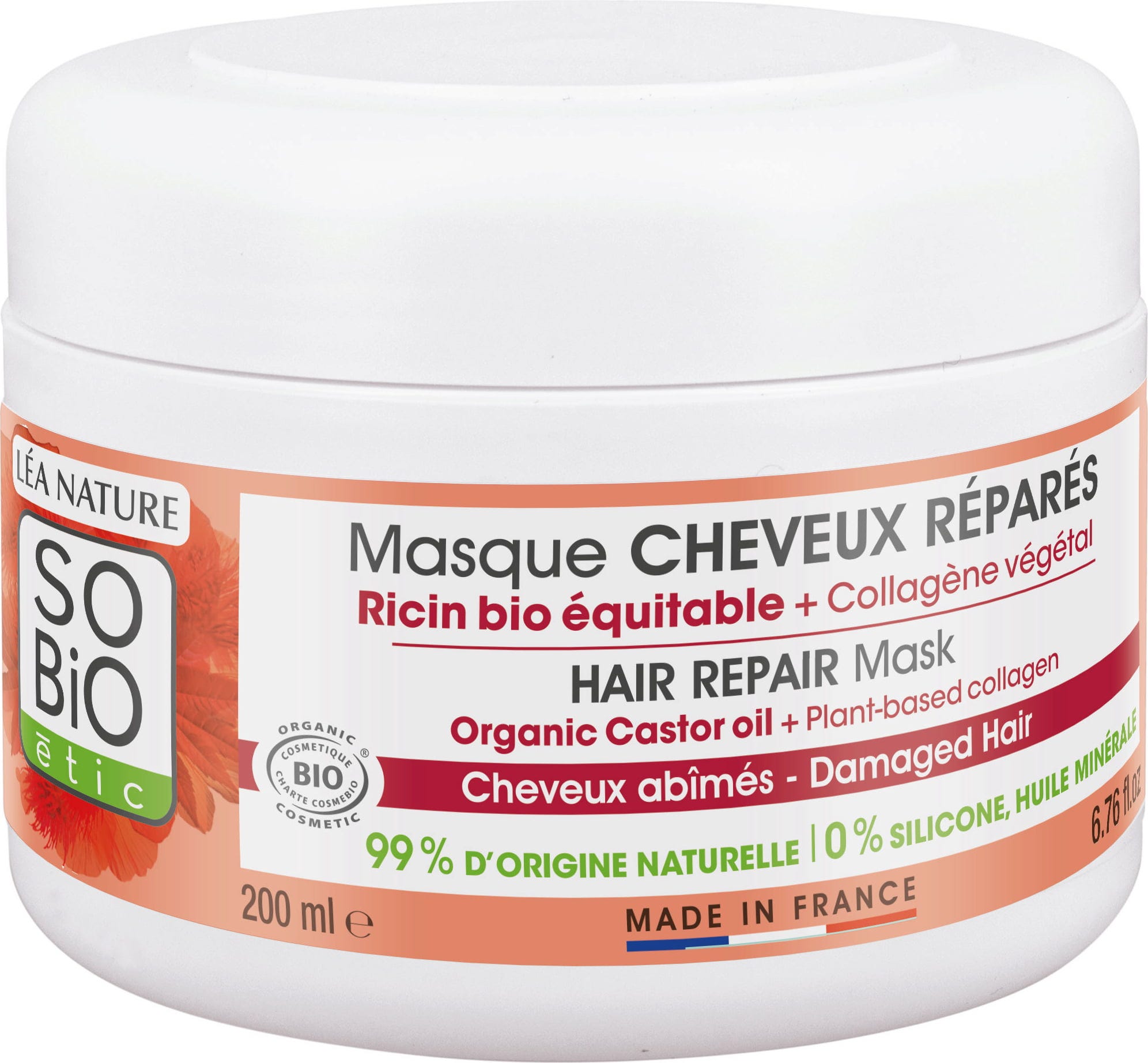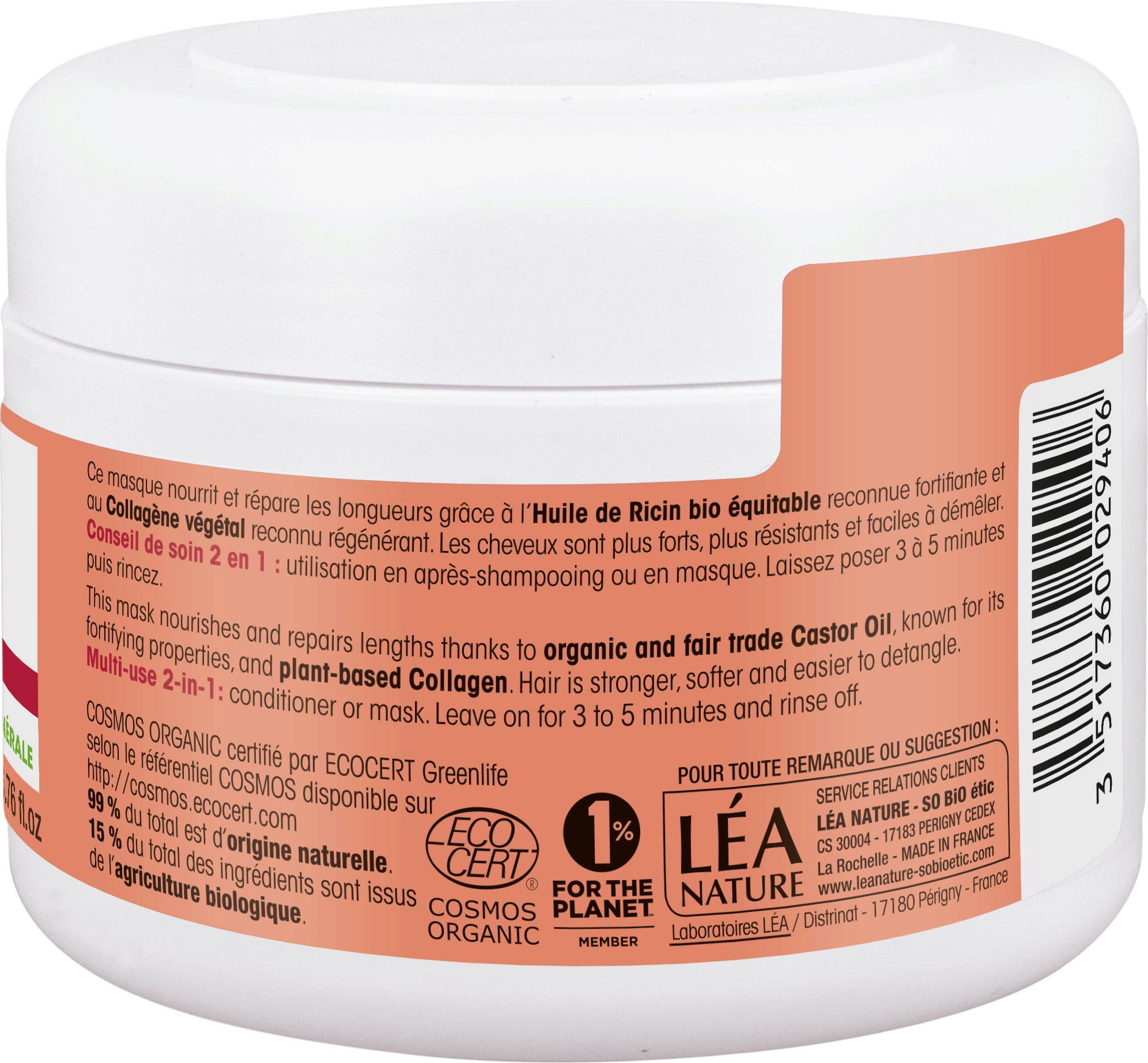Această mască îngrijește lungimile părului datorită uleiului de ricin bio, cunoscut pentru efectele sale de întărire, combinat cu colagen vegetal. Părul pare mai puternic, mai rezistent și mai ușor de pieptănat.