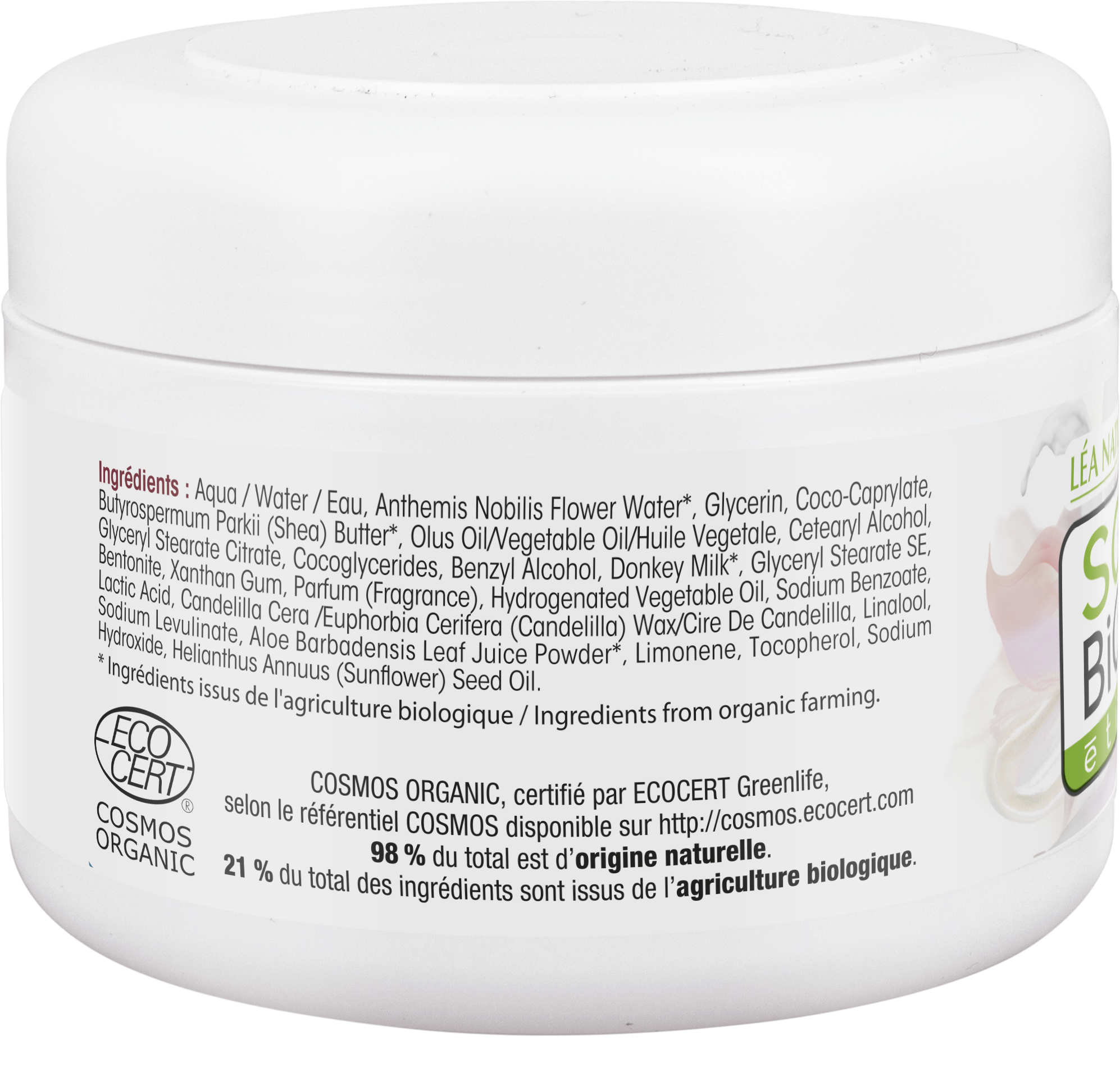 Aqua, Anthemis Nobilis Flower Water[1], Isopropyl Palmitate, Glycerin, Butyrospermum Parkii (Shea) Butter[1], Coco Glycerides, Vegetable Oil, Glyceryl Stearat Citrat, Cetearylalcohol, Benzyl Alcohol, Lacta Asinus[1], Glyceryl Stearate Se, Bentonite (Volcanic Clay), Parfum, Xanthan Gum, Hydrogenated Vegetable Oil, Sodium Benzoate, Lactic Acid, Euphorbia Cerifera (Candelilla) Cera, Sodium Levulinate, Helianthus Annus (Sunflower) Seed Oil, Tocopherol (Vitamin E), Linalool, Aloe Barbadensis (Aloe Vera) Leaf Juice Powder[1], Benzyl Salicylate