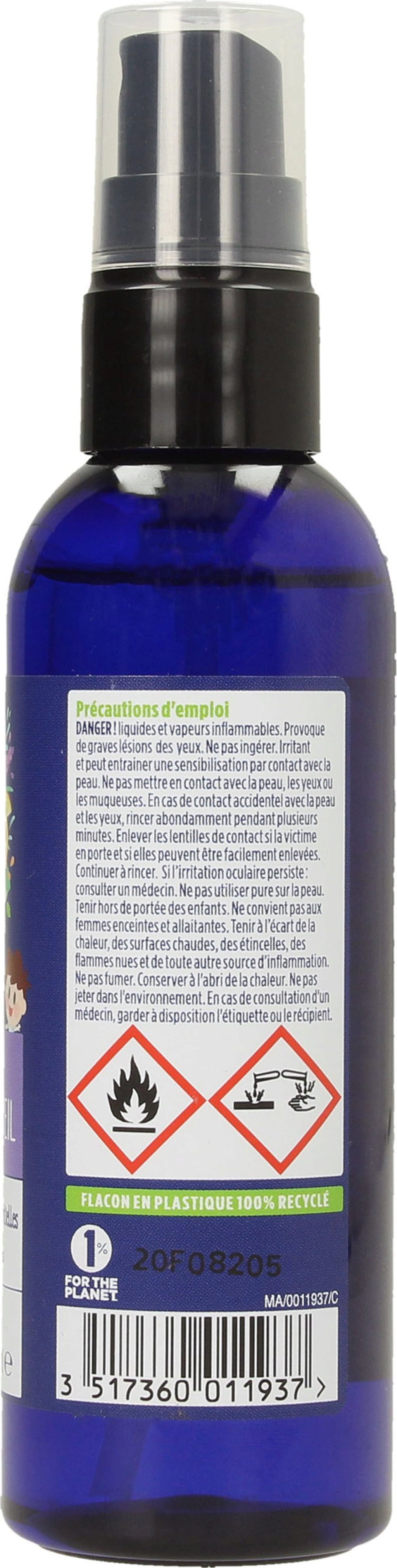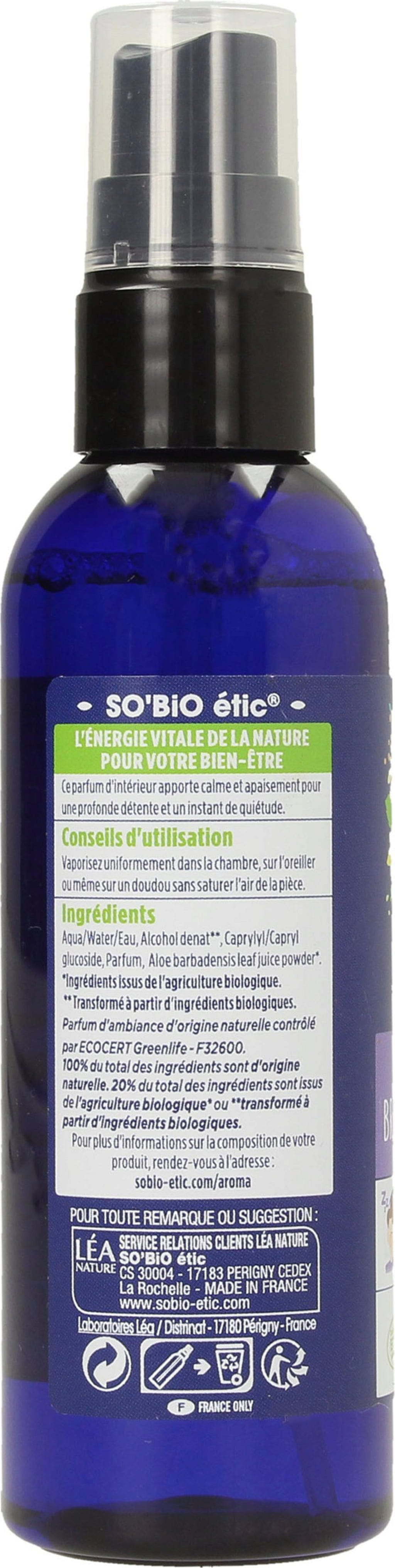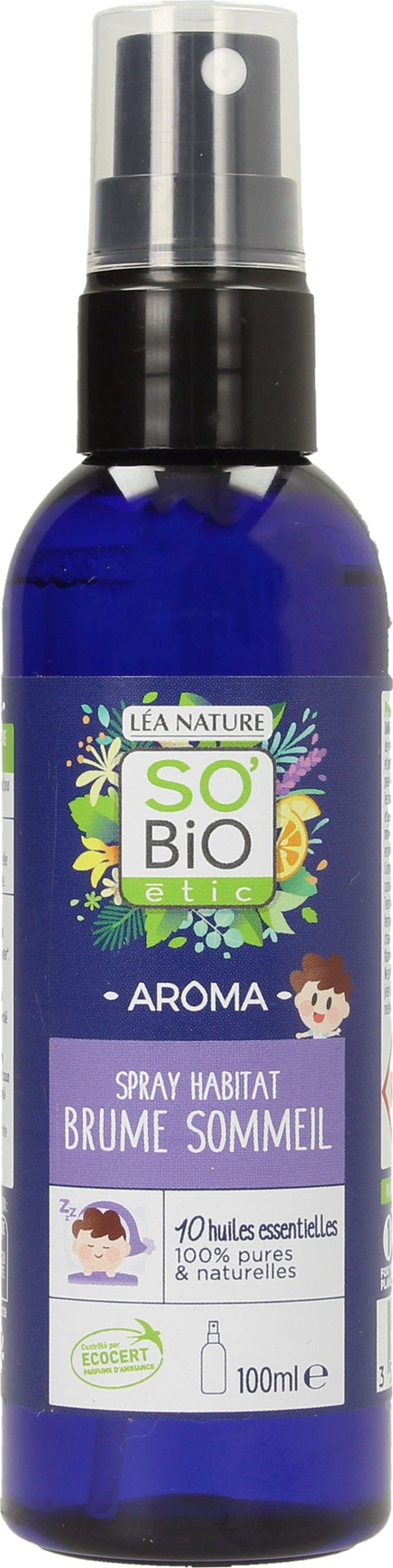 "Brume sommeil" înseamnă "ceață de somn" și este un amestec liniștitor și relaxant de 6 uleiuri esențiale: mușețel, lavandă, portocală, mandarină, și geraniu, precum și extract de vanilie.