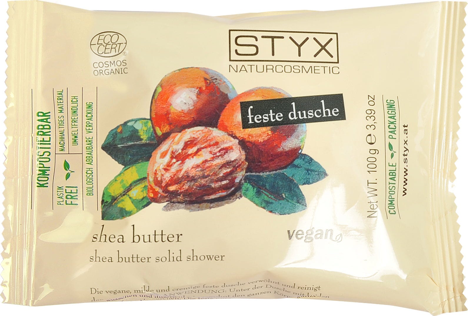 Săpunul solid de duș de la Styx oferă o îngrijire bogată cu prețiosul unt de shea, care lasă pielea catifelată și moale. Spuma sa blândă, cremoasă și plăcut parfumată răsfață corpul și sufletul. Un mare avantaj este randamentul său. 100g corespund cu 600 ml de gel de duș.