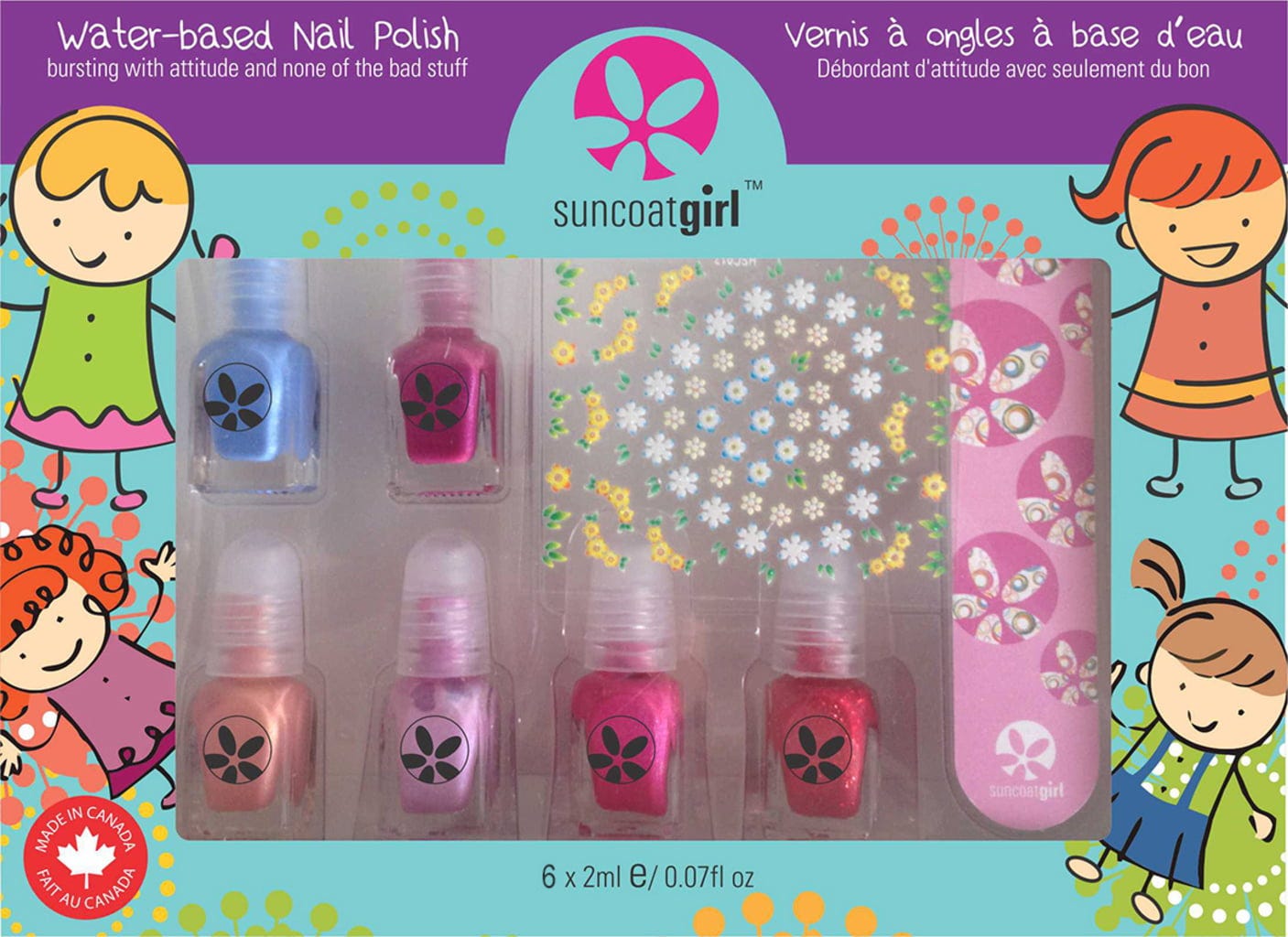 Setul Mini Mani include cele șase nuanțe de ojă preferate de la Suncoatgirl, împreună cu o pilă și o foaie de autocolante cool pentru unghii! Perfect pentru cadouri sau pentru după-amiezi relaxante de frumusețe pentru părinți și copii!