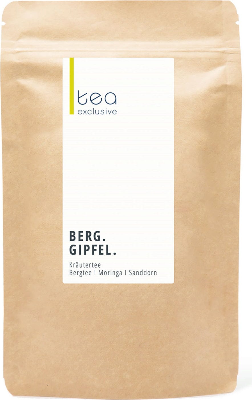 Griechischer Bergtee, Fenchel, Orangenschalen, Zitronengras, Eukalyptusblätter, süße Brombeerblätter, Moringa-Blätter, Zitronenschale, Grüne Minze, Gojibeeren, Sanddornbeeren, Sonnenblumenblüten