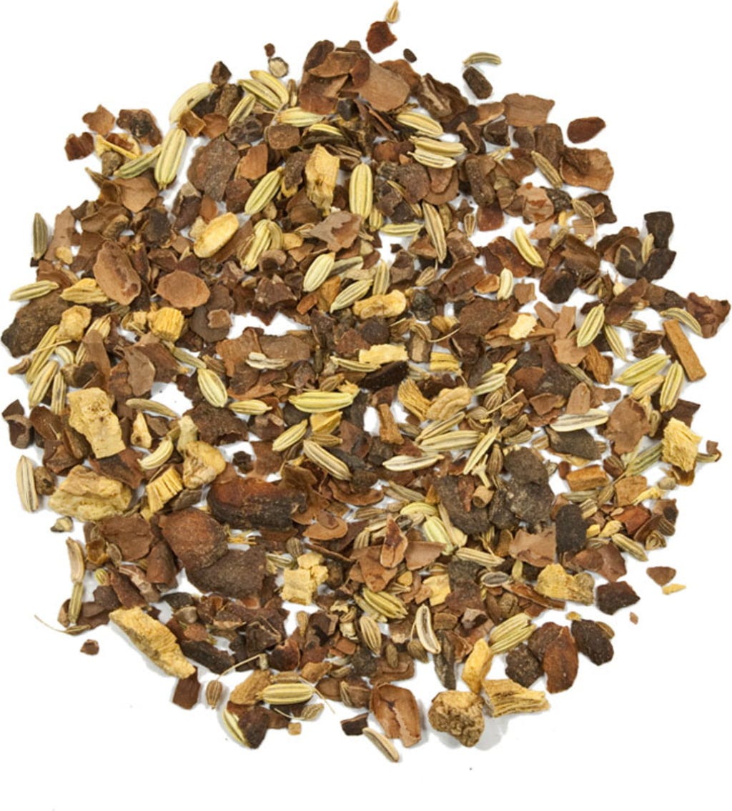 Kakaoschalen, Ingwer, Fenchel, Anissamen, Zimt, Kardamom, Pfeffer, Nelken, Süßholzwurzeln