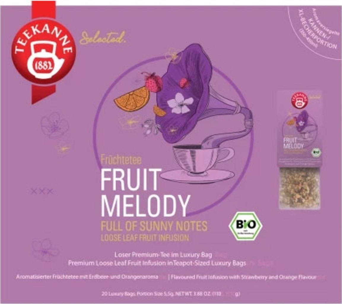 Gustul fructat și dulce al Fruct Melody amintește de o zi plăcută de vară. Mărul, hibiscusul, măceșul și cojile de portocale sunt rafinate cu arome naturale de căpșuni și portocale. Plăcerea ceaiului fără cofeină pentru întreaga familie, în orice moment al zilei.