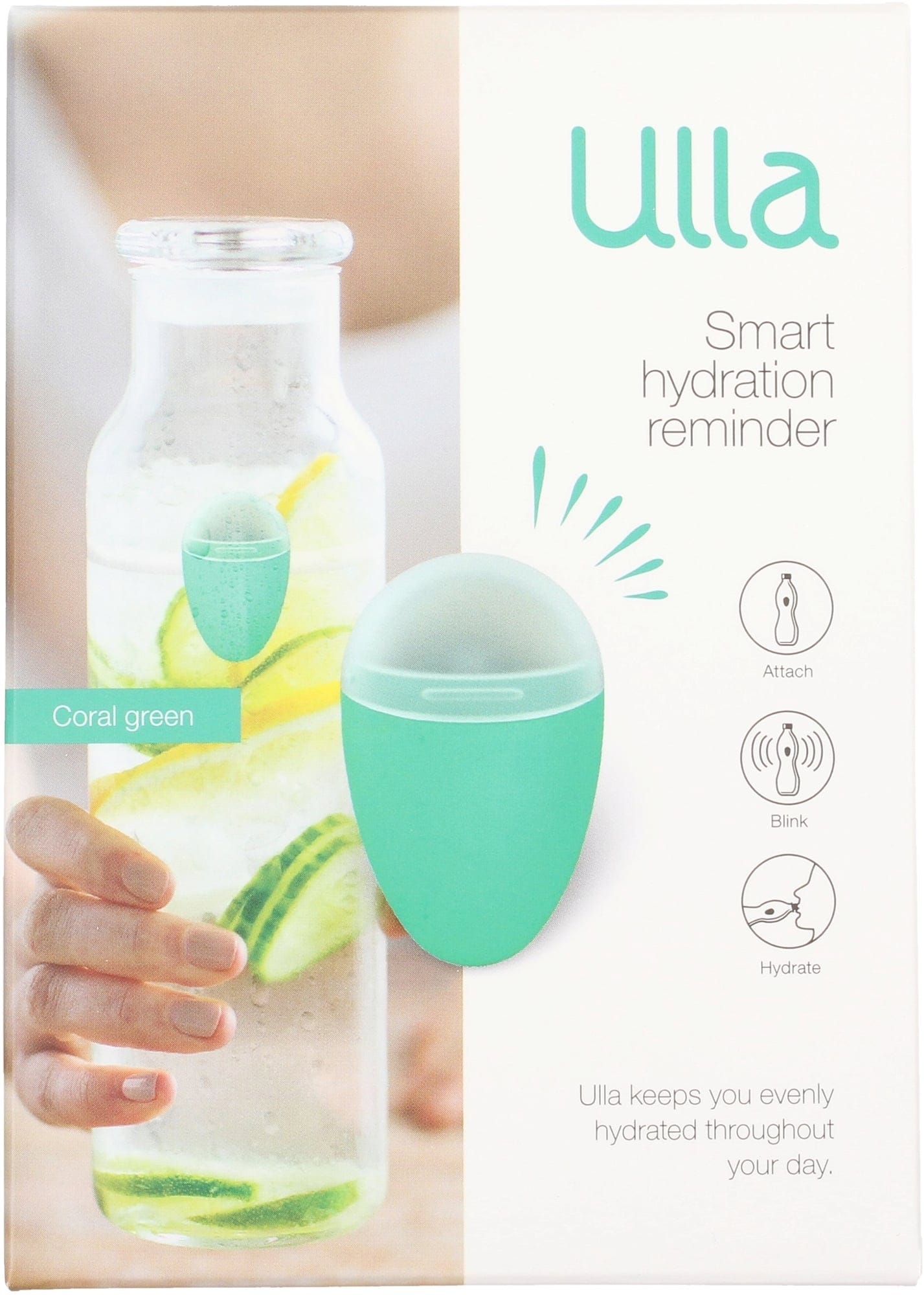Ulla se potrivește pe sticla ta, știe când bei și luminează intermitent atunci când ai nevoie de mai multă apă în corpul și viața ta. Ceasul inteligent de băut începe să lumineze intermitent dacă nu ai mai băut apă de mult timp. Cu ciclul optim de hidratare al Ulla, obiceiurile tale de hidratare se vor îmbunătăți dramatic. Fără aplicații, fără încărcare, fără griji. Ulla funcționează întotdeauna, dar nu stă niciodată în cale.