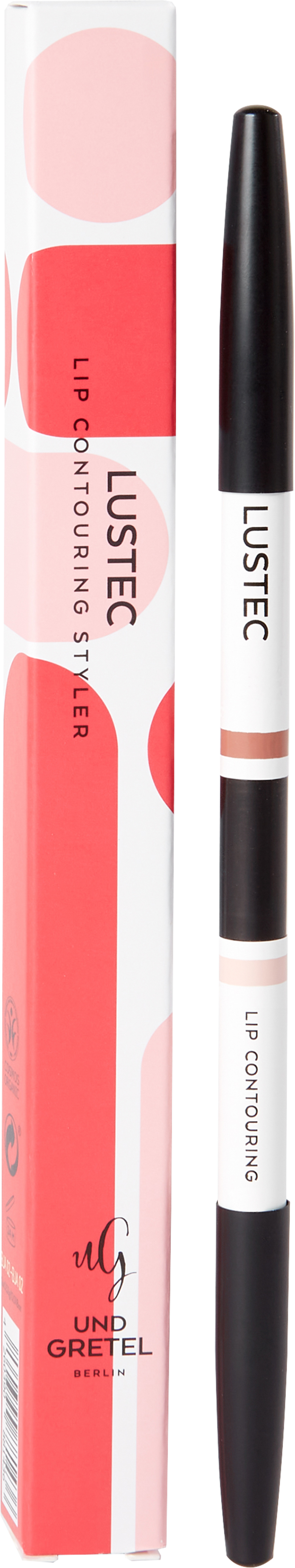 LUSTEC Correcting Lipliner de la UND GRETEL îți oferă două funcții într-un singur creion: Capătul transparent este un corector optic pentru riduri, care formează, de asemenea, o barieră împotriva rujului aplicat ulterior pentru a preveni scurgerea. Acest capăt servește ca bază sau primer. Partea colorată conferă buzelor tale culoarea dorită și subliniază finisajul, după ce, de exemplu, ai aplicat un luciu de buze.