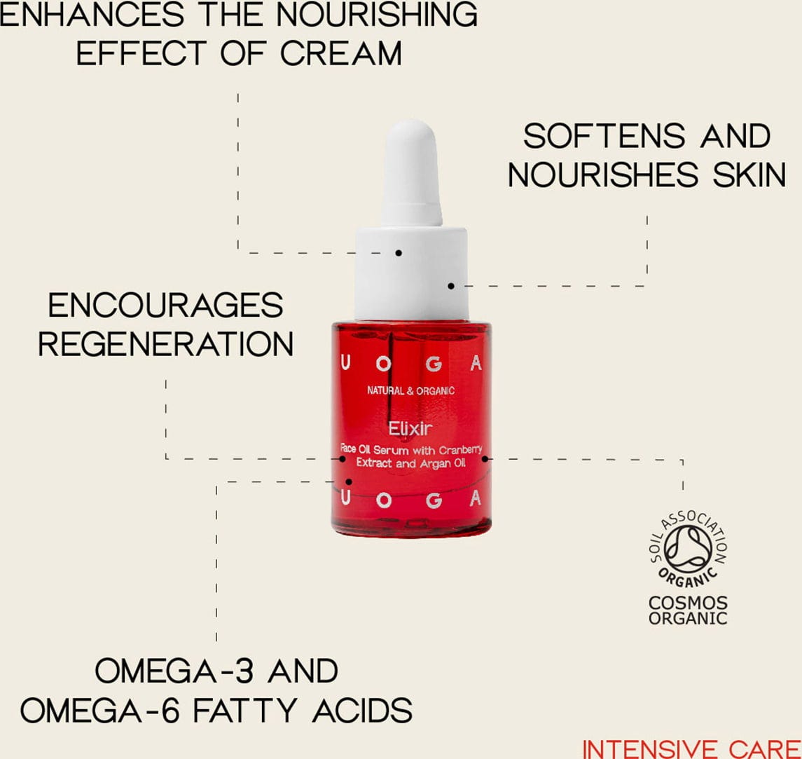 Acest elixir combină cele mai bune uleiuri pentru pielea obosită, îmbătrânirea pielii și formarea ridurilor. Conține ulei de argan bogat în vitamina E, care protejează pielea de radicalii liberi și o catifelează. În combinație cu uleiul de măceșe cu efect echilibrant, precum și cu uleiuri de susan și jojoba, pielea este îngrijită în profunzime și hrănită. Un ingredient rar, dar preferat de uoga uoga, este uleiul de merișor. Acesta are un amestec echilibrat de acizi grași Omega-3 și 6, precum și vitamina E, oferind astfel proprietăți regenerante și conferind catifelare.