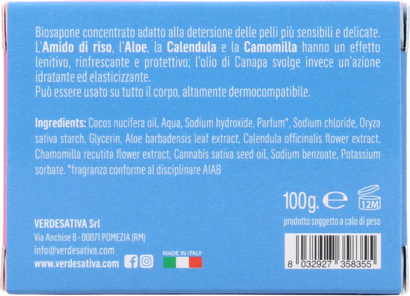Cocos Nucifera (Coconut) Oil, Aqua, Sodium Hydroxyde, Parfum, Sodium Chloride, Oryza Sativa (Rice) Starch, Glycerin, Aloe Barbadensis (Aloe Vera) Leaf Extract, Calendula Officinalis Flower Extract, Chamomilla Recutita (Matricaria) Flower Extract, Cannabis Sativa (Hemp) Seed Oil, Sodium Benzoate, Potassium Sorbate