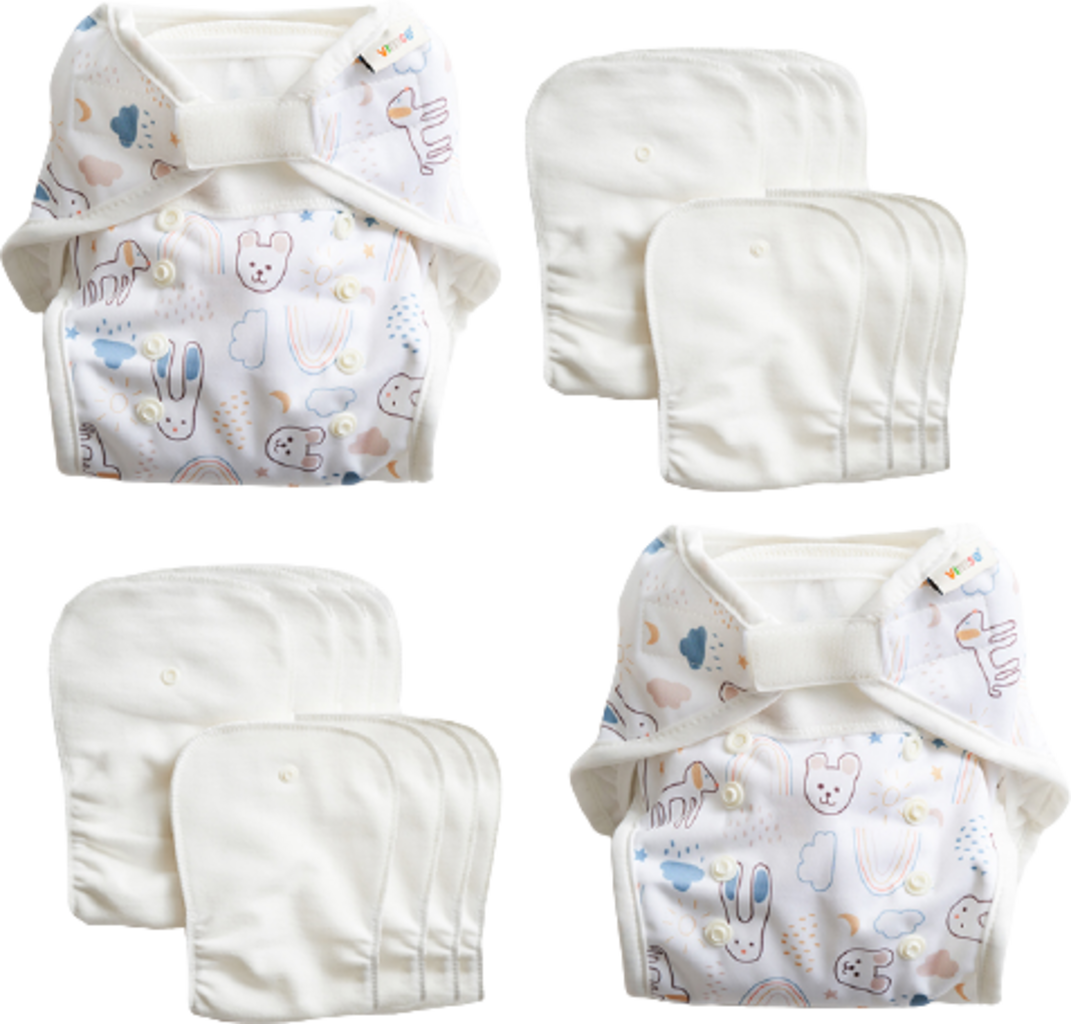 Cutia Starter de la Vimse conține scutece textile cu un design nou și inovator. Datorită benzilor moi de Velcro și a butonilor de ajustare, scutecele se adaptează perfect la corpul bebelușului tău și cresc, practic, odată cu acesta. Scutecele One Size constau într-un sistem format din două părți (All-in-Two): un pantalonaș de protecție impermeabil și două inserții interschimbabile. În cazul unui bebeluș care cântărește sub 8 kg, este suficientă inserția mică, altfel, inserția mare și cea mică sunt combinate.