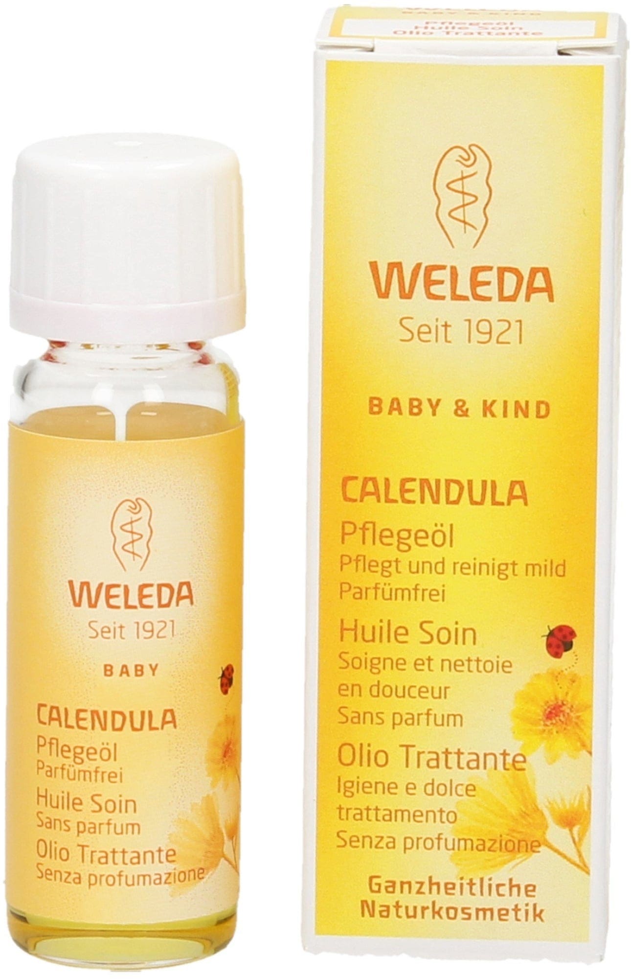 Weleda Calendula, ulei de ingrijire nu este parfumat și este ideal pentru îngrijirea pielii de zi cu zi și a curățării zonei de scutec. Conține extract de gălbenele din agricultura ecologică controlată, care ajută la prevenirea iritatiilor pielii și rănilor minore. Uleiul de susan din cultivarea biologica controlata este potrivit pentru masajul ușor al copilului,deoarece are efect de încălzire ușoară.Pentru masaj este nevoie doar de putin ulei.