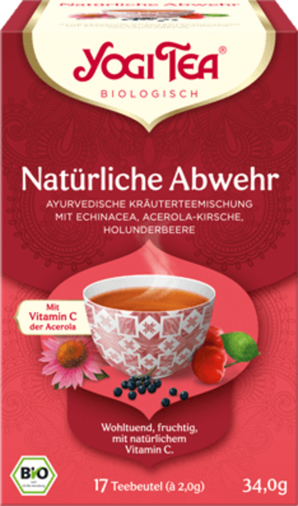 - Este momentul perfect să savurați o ceașcă fierbinte de YOGI TEA® Apărare Naturală în timpul schimbării anotimpurilor, când vremea variază puternic. Gustul fin-amărui al echinaceei se îmbină cu fructul de soc și busuiocul aromat. Valoarea naturală a vitaminei C din ciresele Acerola completează compoziția.